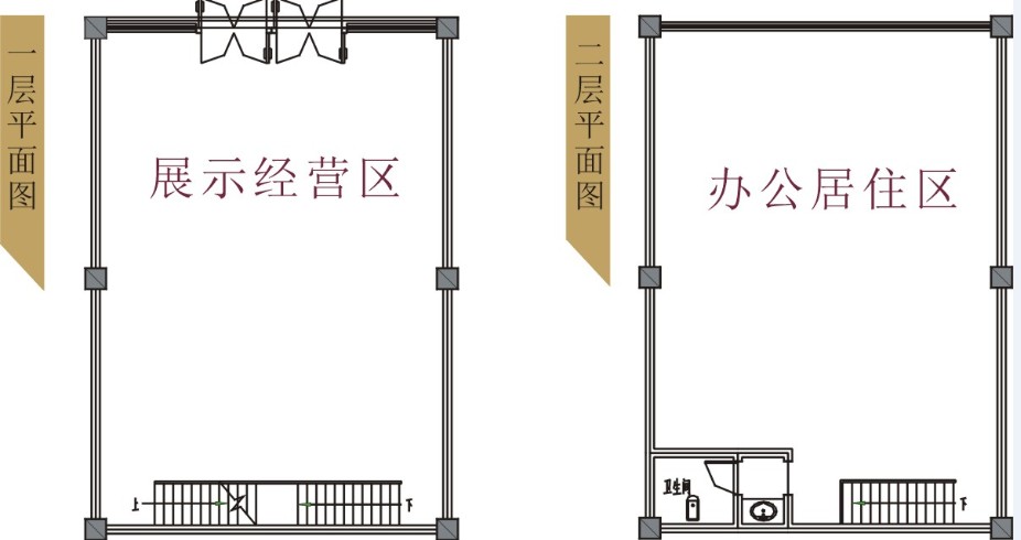 三位一体的户型设计可满足您的展示经营、办公、居家需要,一层可作产品展示经营区或客户接待;二层配备卫生间,适于居住或办公。(见户型示意图)
